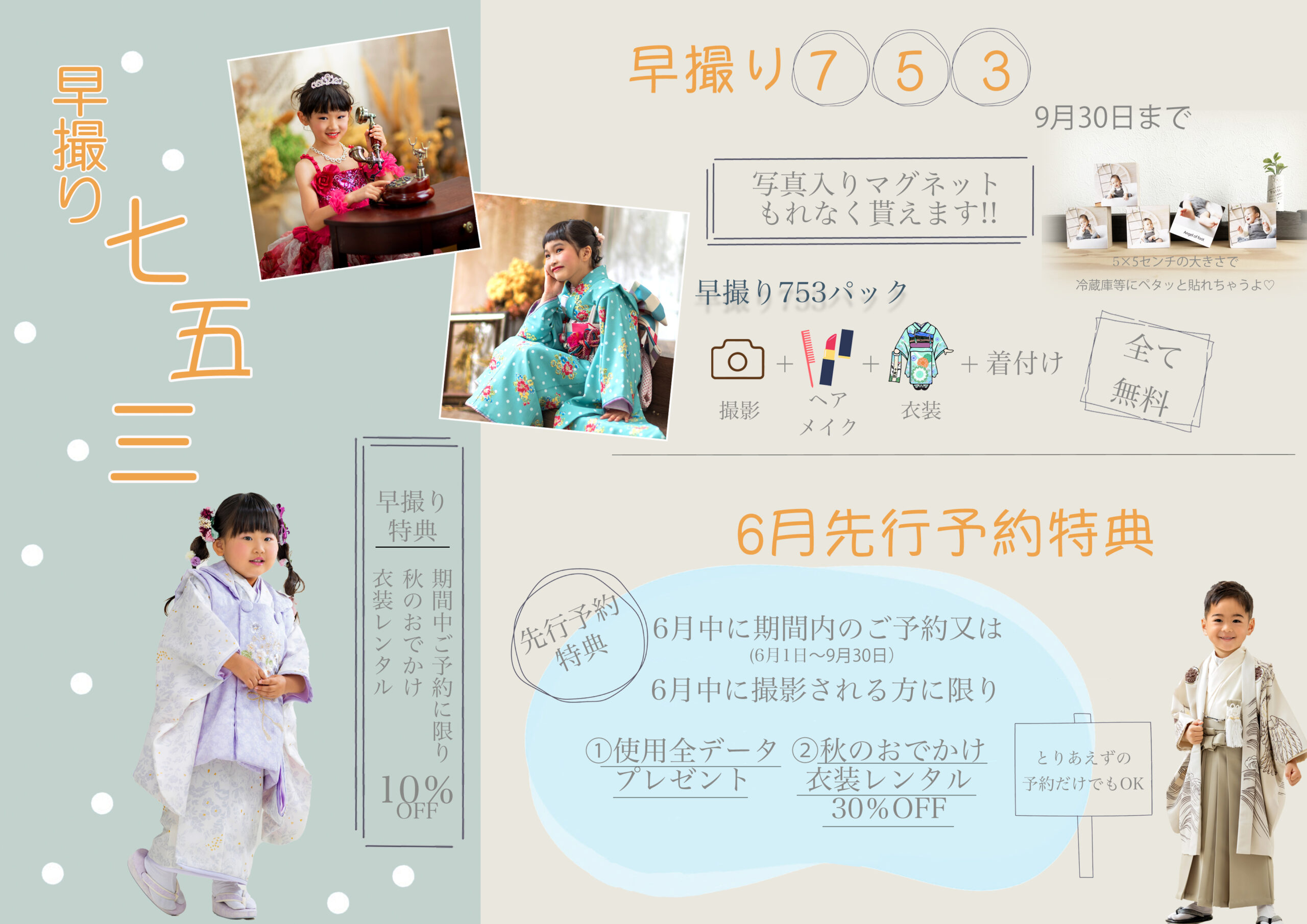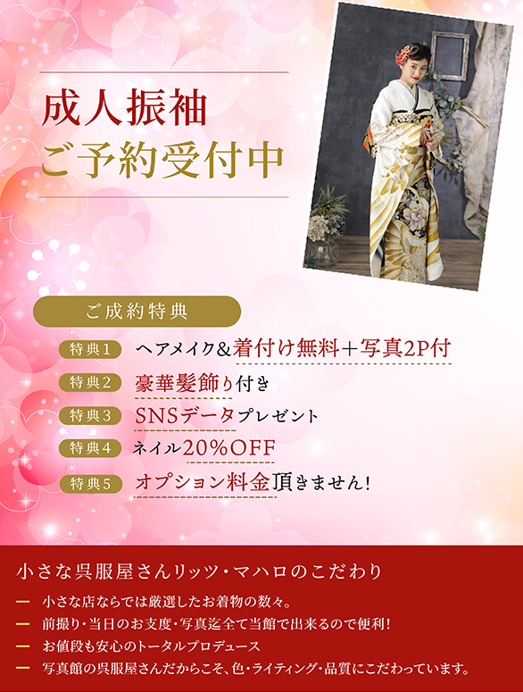 特に七五三や成人式では、写真・衣装・美容がまとめて当館で出来るトータルフォトスタジオとして好評を得ています。